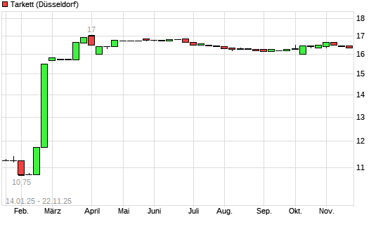 Mit dem Rücksetzer auf 15,95 EUR hat die Tarkett SA Ord Shs-Aktie (ISIN FR0004188670) am 21.11.2025 ein neues 6-Monats-Tief erreicht und damit den Kurs vom 02.09.2025 eingestellt.Die Tarkett ...weiterlesen