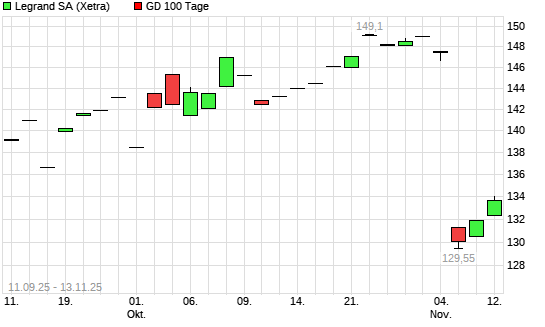 Mit dem Anstieg auf 132,60 EUR hat die Legrand-Aktie am 12.11.2025 die 100-Tage-Linie nach oben gekreuzt.Die Legrand-Aktie befindet sich seit dem 06.05.2025 im langfristigen Aufwärtstrend und ...weiterlesen