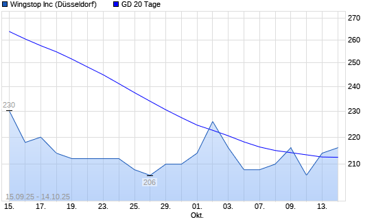 Mit dem Rücksetzer auf 208,00 EUR hat die Wingstop-Aktie am 13.10.2025 die 20-Tage-Linie nach unten gekreuzt.Die Wingstop-Aktie befindet sich seit dem 05.09.2025 im langfristigen Abwärtstrend ...weiterlesen