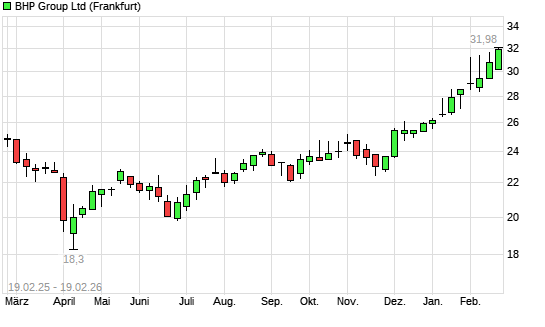 Mit dem Anstieg auf 31,59 EUR hat die BHP Group-Aktie (ISIN AU000000BHP4) am 18.02.2026 ein neues 12-Monats-Hoch erreicht und damit den Kurs vom 11.02.2026 eingestellt.Die BHP ...weiterlesen