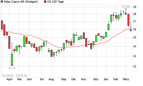 Mit dem Rücksetzer auf 15,94 EUR hat die Atlas Copco A-Aktie am 13.03.2026 die 100-Tage-Linie nach unten gekreuzt.Die Atlas Copco A-Aktie befindet sich seit dem 28.11.2025 ...weiterlesen