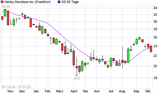 Mit dem Rücksetzer auf 23,38 EUR hat die Harley-Davidson-Aktie am 06.10.2025 die 50-Tage-Linie nach unten gekreuzt.Die Harley-Davidson-Aktie befindet sich seit dem 25.08.2025 im langfristigen ...weiterlesen
