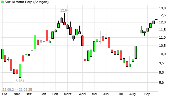 Mit dem Anstieg auf 12,22 EUR hat die Suzuki Motor-Aktie (ISIN JP3397200001) am 22.09.2025 ein neues 6-Monats-Hoch erreicht und damit den Kurs vom 09.09.2025 eingestellt.Die Suzuki Motor-Aktie ...weiterlesen