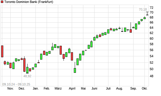 Mit dem Anstieg auf 69,45 EUR hat die Toronto-Dominion Bank-Aktie (ISIN CA8911605092) am 08.10.2025 ein neues 3-Jahres-Hoch erreicht und damit den Kurs vom 07.10.2025 eingestellt.Die Toronto-Dominion ...weiterlesen