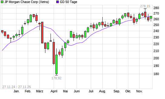 Mit dem Anstieg auf 265,20 EUR hat die JP Morgan Chase-Aktie am 26.11.2025 die 50-Tage-Linie nach oben gekreuzt.Die JP Morgan Chase-Aktie befindet sich seit dem 02.05.2025 im langfristigen Aufwärtstrend ...weiterlesen