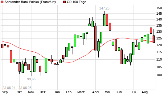 Mit dem Rücksetzer auf 121,80 EUR hat die Bank Zachodni-Aktie am 22.08.2025 die 100-Tage-Linie nach unten gekreuzt.Die Bank Zachodni-Aktie befindet sich seit dem 18.07.2025 im langfristigen ...weiterlesen