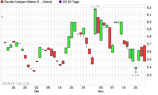 Mit dem Anstieg auf 5,61 EUR hat die Davide Campari-Milano-Aktie am 25.11.2025 die 50-Tage-Linie nach oben gekreuzt.Die Davide Campari-Milano-Aktie befindet sich seit dem 13.11.2025 im langfristigen ...weiterlesen
