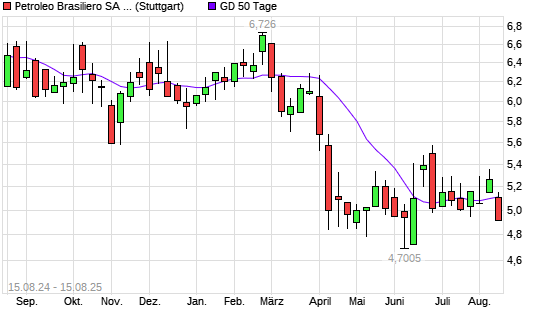 Mit dem Rücksetzer auf 4,99 EUR hat die Petroleo Brasileiro-Aktie am 14.08.2025 die 50-Tage-Linie nach unten gekreuzt.Die Petroleo Brasileiro-Aktie befindet sich seit dem 02.04.2025 im ...weiterlesen