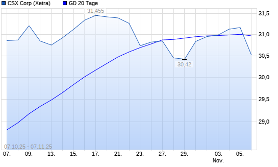 Mit dem Rücksetzer auf 30,56 EUR hat die CSX-Aktie am 06.11.2025 die 20-Tage-Linie nach unten gekreuzt.Die CSX-Aktie befindet sich seit dem 24.09.2025 im langfristigen Aufwärtstrend und ...weiterlesen