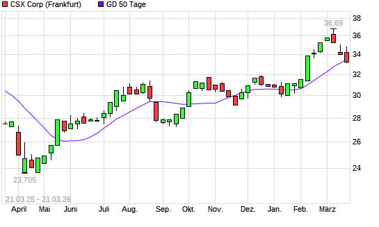 Mit dem Rücksetzer auf 33,21 EUR hat die CSX-Aktie am 20.03.2026 die 50-Tage-Linie nach unten gekreuzt.Die CSX-Aktie befindet sich seit dem 24.09.2025 im langfristigen ...weiterlesen