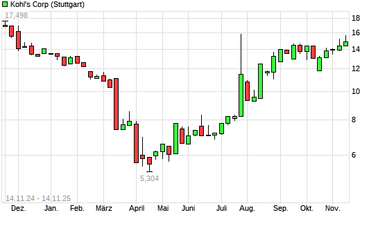 Mit dem Anstieg auf 15,49 EUR hat die Kohl's-Aktie (ISIN US5002551043) am 13.11.2025 ein neues 6-Monats-Hoch erreicht und damit den Kurs vom 12.11.2025 eingestellt.Die Kohl's-Aktie befindet ...weiterlesen