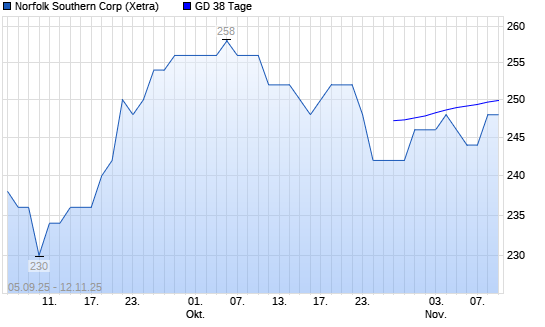 Mit dem Anstieg auf 248,00 EUR hat die Norfolk Southern-Aktie am 11.11.2025 die 38-Tage-Linie nach oben gekreuzt.Die Norfolk Southern-Aktie befindet sich seit dem 17.07.2025 im langfristigen ...weiterlesen