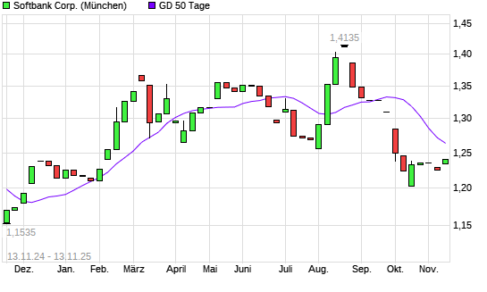 Mit dem Anstieg auf 1,27 EUR hat die Softbank Corp.-Aktie am 12.11.2025 die 50-Tage-Linie nach oben gekreuzt.Die Softbank Corp.-Aktie befindet sich seit dem 30.09.2025 im langfristigen Abwärtstrend ...weiterlesen