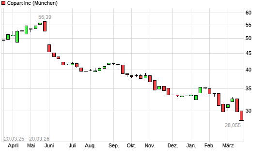 Mit dem Rücksetzer auf 28,48 EUR hat die Copart-Aktie (ISIN US2172041061) am 19.03.2026 ein neues 3-Jahres-Tief erreicht und damit den Kurs vom 17.03.2026 eingestellt.Die ...weiterlesen