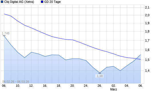 Mit dem Anstieg auf 1,54 EUR hat die Cliq Digital-Aktie am 05.03.2026 die 20-Tage-Linie nach oben gekreuzt.Die Cliq Digital-Aktie befindet sich seit dem 01.08.2025 im ...weiterlesen
