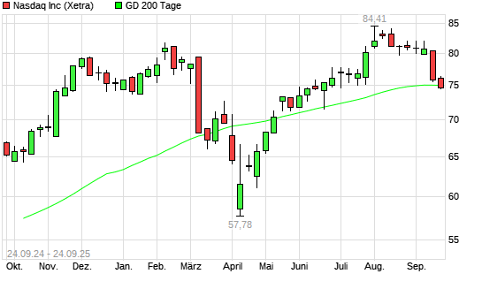 Mit dem Rücksetzer auf 74,63 EUR hat die Nasdaq Inc.-Aktie am 23.09.2025 die 200-Tage-Linie nach unten gekreuzt.Die Nasdaq Inc.-Aktie befand sich seit dem 23.05.2025 im langfristigen Abwärtstrend ...weiterlesen