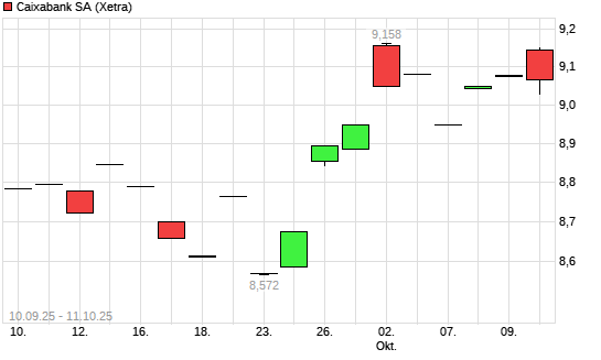 Mit dem Anstieg auf 9,11 EUR hat die Caixabank-Aktie (ISIN ES0140609019) am 10.10.2025 ein neues All-Time-High erreicht und damit den Kurs vom 01.10.2025 eingestellt.Die Caixabank-Aktie befindet ...weiterlesen