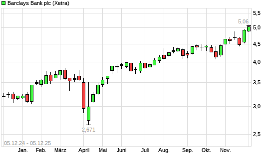 Mit dem Anstieg auf 5,04 EUR hat die Barclays Bank-Aktie (ISIN GB0031348658) am 04.12.2025 ein neues 10-Jahres-Hoch erreicht und damit den Kurs vom 02.12.2025 eingestellt.Die Barclays Bank-Aktie ...weiterlesen