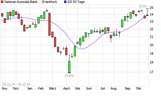 Mit dem Rücksetzer auf 23,82 EUR hat die National Australia Bank-Aktie am 24.10.2025 die 50-Tage-Linie nach unten gekreuzt.Die National Australia Bank-Aktie befindet sich seit dem 18.08.2025 ...weiterlesen