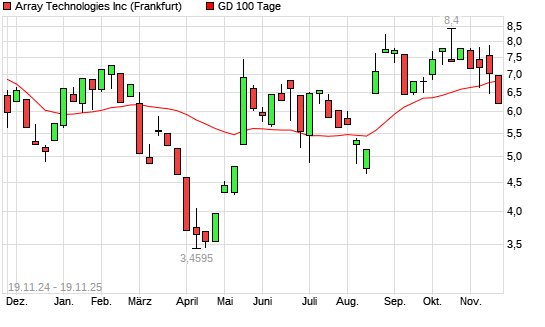 Mit dem Rücksetzer auf 6,28 EUR hat die Array Technologies-Aktie am 18.11.2025 die 100-Tage-Linie nach unten gekreuzt.Die Array Technologies-Aktie befindet sich seit dem 18.08.2025 im langfristigen ...weiterlesen