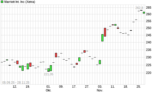 Mit dem Anstieg auf 261,95 EUR hat die Marriott International-Aktie (ISIN US5719032022) am 27.11.2025 ein neues 6-Monats-Hoch erreicht und damit den Kurs vom 26.11.2025 eingestellt.Die Marriott ...weiterlesen
