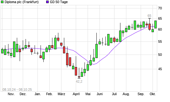 Mit dem Anstieg auf 64,00 EUR hat die Diploma-Aktie am 07.10.2025 die 50-Tage-Linie nach oben gekreuzt.Die Diploma-Aktie befindet sich seit dem 20.05.2025 im langfristigen Aufwärtstrend und ...weiterlesen