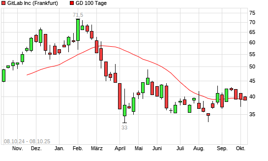 Mit dem Rücksetzer auf 38,90 EUR hat die GitLab-Aktie am 07.10.2025 die 100-Tage-Linie nach unten gekreuzt.Der Abstand zur 200-Tage-Linie beträgt aktuell -14,23%. ...weiterlesen