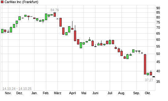 Mit dem Rücksetzer auf 37,37 EUR hat die CarMax-Aktie (ISIN US1431301027) am 13.10.2025 ein neues 5-Jahres-Tief erreicht und damit den Kurs vom 01.10.2025 eingestellt.Die CarMax-Aktie befindet ...weiterlesen