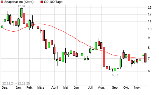 Mit dem Rücksetzer auf 6,69 EUR hat die Snap-Aktie am 21.11.2025 die 100-Tage-Linie nach unten gekreuzt.Die Snap-Aktie befindet sich seit dem 13.11.2025 im langfristigen Abwärtstrend und ...weiterlesen