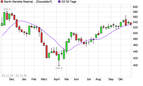 Mit dem Anstieg auf 531,00 EUR hat die Martin Marietta Materials-Aktie am 31.10.2025 die 50-Tage-Linie nach oben gekreuzt.Die Martin Marietta Materials-Aktie befindet sich seit dem 30.05.2025 ...weiterlesen