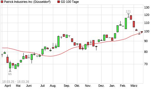 Mit dem Rücksetzer auf 99,00 EUR hat die Patrick Industries-Aktie am 17.03.2026 die 100-Tage-Linie nach unten gekreuzt.Die Patrick Industries-Aktie befindet sich seit dem ...weiterlesen