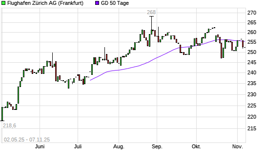 Mit dem Rücksetzer auf 252,60 EUR hat die Flughafen Zürich-Aktie am 06.11.2025 die 50-Tage-Linie nach unten gekreuzt.Der Abstand zur 200-Tage-Linie beträgt aktuell +5,16%.