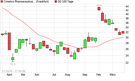 Mit dem Anstieg auf 32,40 EUR hat die CRINETICS PHARM.-Aktie am 16.03.2026 die 100-Tage-Linie nach oben gekreuzt.Die CRINETICS PHARM.-Aktie befindet sich seit dem 08.10.2025 ...weiterlesen