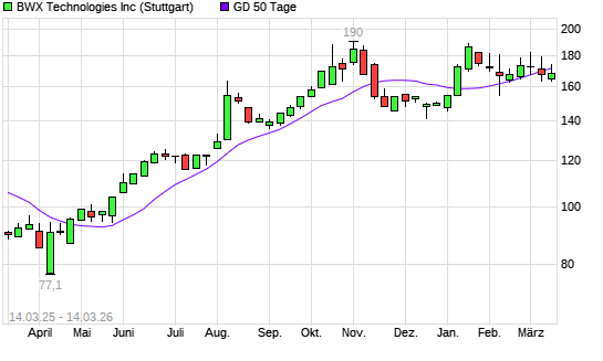 Mit dem Anstieg auf 172,90 EUR hat die BWX Technologies-Aktie am 13.03.2026 die 50-Tage-Linie nach oben gekreuzt.Die BWX Technologies-Aktie befindet sich seit dem 26.05.2025 ...weiterlesen