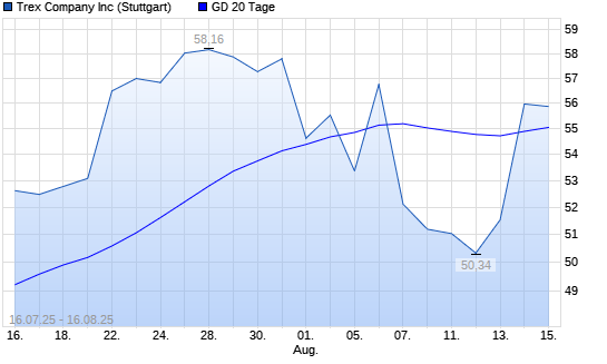 Mit dem Rücksetzer auf 53,70 EUR hat die Trex-Aktie am 15.08.2025 die 20-Tage-Linie nach unten gekreuzt.Die Trex-Aktie befindet sich seit dem 11.02.2025 im langfristigen Abwärtstrend und ...weiterlesen