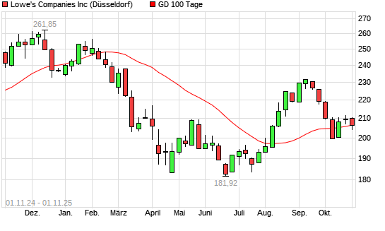 Mit dem Anstieg auf 207,10 EUR hat die Lowe's Companies-Aktie am 31.10.2025 die 100-Tage-Linie nach oben gekreuzt.Die Lowe's Companies-Aktie befindet sich seit dem 01.10.2025 im langfristigen ...weiterlesen