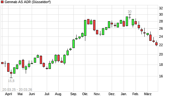 Mit dem Rücksetzer auf 22,40 EUR hat die Genmab A/S-Aktie (ISIN US3723032062) am 19.03.2026 ein neues 6-Monats-Tief erreicht und damit den Kurs vom 13.03.2026 eingestellt.Die ...weiterlesen