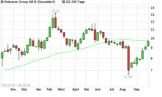 Mit dem Anstieg auf 9,83 EUR hat die Embracer Group-Aktie am 02.10.2025 die 200-Tage-Linie nach oben gekreuzt.Die Embracer Group-Aktie befand sich seit dem 25.06.2025 im langfristigen Abwärtstrend ...weiterlesen