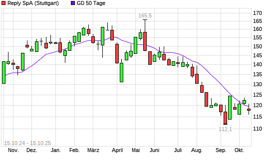 Mit dem Rücksetzer auf 118,10 EUR hat die Reply-Aktie am 14.10.2025 die 50-Tage-Linie nach unten gekreuzt.Die Reply-Aktie befindet sich seit dem 13.06.2025 im langfristigen Abwärtstrend ...weiterlesen