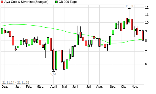 Mit dem Rücksetzer auf 8,10 EUR hat die Aya Gold & Silver-Aktie am 20.11.2025 die 200-Tage-Linie nach unten gekreuzt.Die Aya Gold & Silver-Aktie befand sich seit dem 26.09.2025 im langfristigen ...weiterlesen