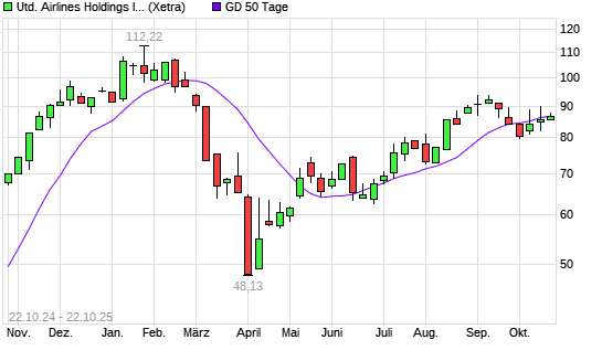 Mit dem Rücksetzer auf 86,40 EUR hat die United Airlines-Aktie am 21.10.2025 die 50-Tage-Linie nach unten gekreuzt.Die United Airlines-Aktie befindet sich seit dem 02.10.2025 im langfristigen ...weiterlesen