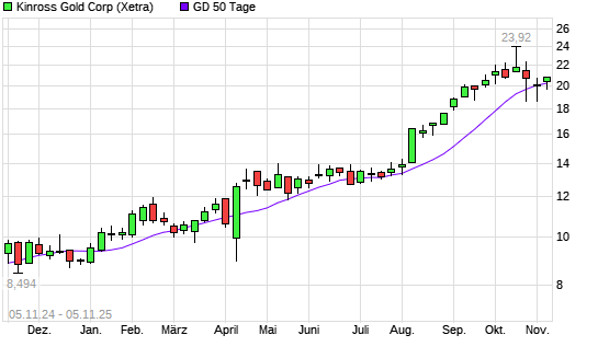 Mit dem Rücksetzer auf 19,90 EUR hat die Kinross Gold-Aktie am 04.11.2025 die 50-Tage-Linie nach unten gekreuzt.Die Kinross Gold-Aktie befindet sich seit dem 07.03.2024 im langfristigen ...weiterlesen