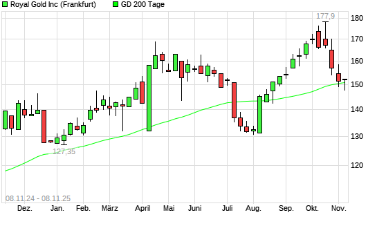 Mit dem Anstieg auf 152,40 EUR hat die Royal Gold-Aktie am 07.11.2025 die 200-Tage-Linie nach oben gekreuzt.Die Royal Gold-Aktie befand sich seit dem 04.11.2025 im langfristigen Abwärtstrend ...weiterlesen