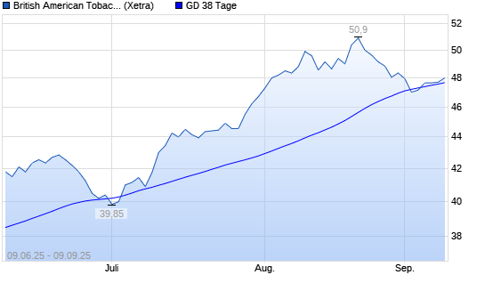 Mit dem Rücksetzer auf 47,50 EUR hat die British American Tobacco-Aktie am 08.09.2025 die 38-Tage-Linie nach unten gekreuzt.Die British American Tobacco-Aktie befindet sich seit dem 31.05.2024 ...weiterlesen