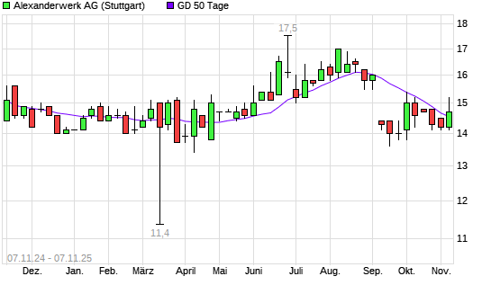 Mit dem Anstieg auf 14,50 EUR hat die Alexanderwerk-Aktie am 06.11.2025 die 50-Tage-Linie nach oben gekreuzt.Die Alexanderwerk-Aktie befindet sich seit dem 08.10.2025 im langfristigen Abwärtstrend ...weiterlesen