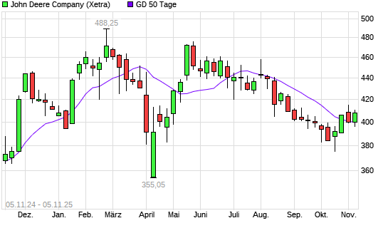 Mit dem Rücksetzer auf 399,00 EUR hat die John Deere-Aktie am 04.11.2025 die 50-Tage-Linie nach unten gekreuzt.Die John Deere-Aktie befindet sich seit dem 13.08.2025 im langfristigen Abwärtstrend ...weiterlesen