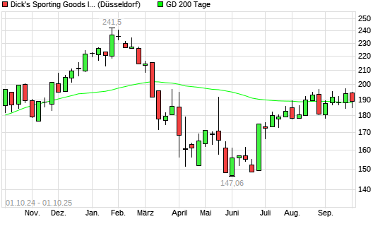 Mit dem Rücksetzer auf 185,04 EUR hat die Dick's Sporting Goods-Aktie am 30.09.2025 die 200-Tage-Linie nach unten gekreuzt.Die Dick's Sporting Goods-Aktie befand sich seit dem 24.09.2025 ...weiterlesen