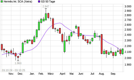 Mit dem Anstieg auf 2.143,00 EUR hat die Hermès-Aktie am 02.10.2025 die 50-Tage-Linie nach oben gekreuzt.Die Hermès-Aktie befindet sich seit dem 30.07.2025 im langfristigen Abwärtstrend ...weiterlesen
