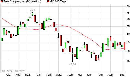 Mit dem Rücksetzer auf 50,80 EUR hat die Trex-Aktie am 09.09.2025 die 100-Tage-Linie nach unten gekreuzt.Die Trex-Aktie befindet sich seit dem 11.02.2025 im langfristigen Abwärtstrend und ...weiterlesen