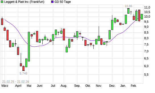 Mit dem Anstieg auf 10,28 EUR hat die Leggett & Platt-Aktie am 20.02.2026 die 50-Tage-Linie nach oben gekreuzt.Die Leggett & Platt-Aktie befindet sich seit dem 24.11.2025 ...weiterlesen